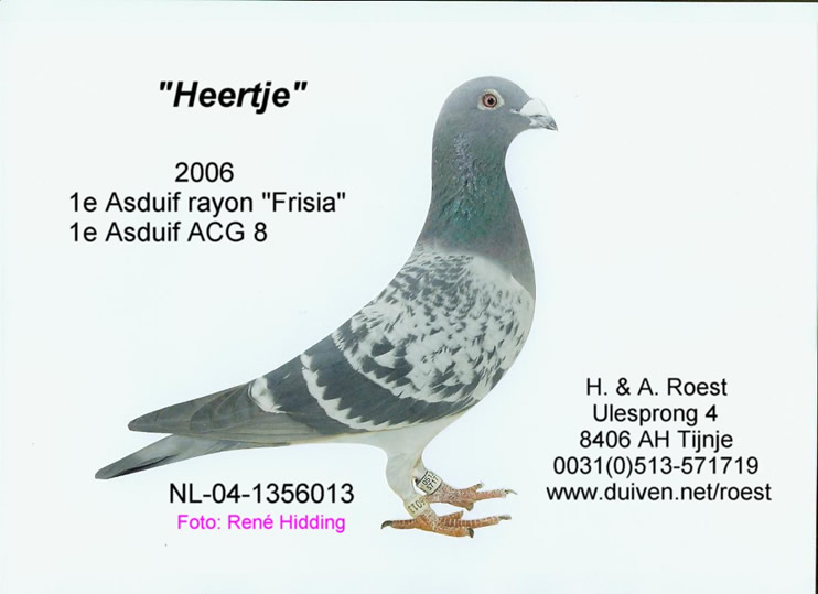 我们的信鸽群体主要基于世界著名的詹森血系上。在80,90年代间以及2003年,我们购买了16羽阿连栋克詹森兄弟的直系后代。自1994年以来,我们也购买了一些鲁塞尔克拉克原鸽舍的直系后代。正如你所知,“克拉克”是百分百的纯詹森血统。目前,我们的鸽舍中仍留有一些詹森直系鸽。近年来,通过购入来自普德波斯(Pulderbos)的比利时冠军安德烈.鲁道夫( Andre Roodhooft )赛鸽的直系后代,我们鸽群的质量更加优异了。安德烈.鲁道夫拥有和著名的詹森兄弟一样多的詹森血统赛鸽。此外,他还拥有来自阿尔芬.安.德莱茵(今鲁威克)的沃克父子优秀直系赛鸽血系。我们购买了一些他们的“奥林匹克.罗纳尔多”,“奥林匹克幸存者”,“奥林匹克索诺”以及其他顶级种鸽的幼鸽。这个强大的团队,加上基于德.威特.布劳斯兄弟( De Wit Bros )养殖的最好的克拉克血系,使我们培育出来更优秀的赛鸽,致使它们能和荷兰最好的赛鸽一起数次代表荷兰参加奥林匹克评比。